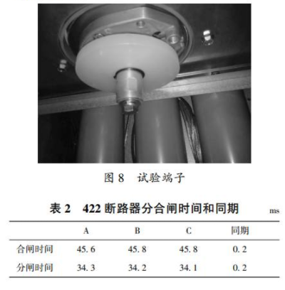 本次試驗(yàn)選取422斷路器進(jìn)行機(jī)械特性測(cè)試,按圖6進(jìn)行試驗(yàn)接線。將4221隔離開(kāi)關(guān)置于接地位置,將試驗(yàn)端子接到柜內(nèi)電纜接口,然后將試驗(yàn)線接到試驗(yàn)端子下端進(jìn)行試驗(yàn)。試驗(yàn)端子如圖8所示。422斷路器分合閘時(shí)間和同期見(jiàn)表2。
