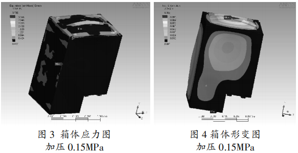 箱壁厚度滿足材料的許應應力要求及氣箱允許變形量要求。通過軟件分析計算后得到氣箱的應力分布(見圖3)及箱體形變(見圖4),最終找到氣箱壁厚。