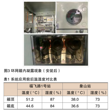 為檢驗(yàn)上述方案的實(shí)際運(yùn)行效果,在福州象山站安裝了一套上述微環(huán)境控制裝置(圖2)。為便于對(duì)比,在福州福飛路1號(hào)站安裝了環(huán)境監(jiān)控裝置,檢測(cè)柜內(nèi)環(huán)境參數(shù)。兩個(gè)環(huán)網(wǎng)站在同一天中,柜內(nèi)相同位置處最高溫濕度對(duì)比結(jié)果(表1)表明,安裝微環(huán)境控制裝置后,通過系統(tǒng)自動(dòng)調(diào)控風(fēng)機(jī)運(yùn)行的時(shí)間,降低環(huán)網(wǎng)箱內(nèi)空氣溫度,可促進(jìn)箱內(nèi)和電纜溝內(nèi)的溫濕度趨于均衡,減少電纜溝內(nèi)潮濕空氣通過電纜接線孔進(jìn)人開關(guān)柜,從而防止開關(guān)柜內(nèi)電氣元件表面的閃絡(luò)現(xiàn)象發(fā)生。系統(tǒng)運(yùn)行后二次艙和電纜艙凝露完全消除。