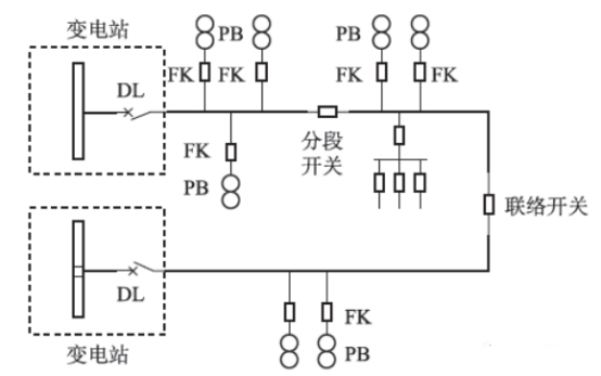 如下圖所示,其作為現(xiàn)階段典型的配電體系拓?fù)鋱D,變電站的10kV出線裝備斷路器和對(duì)應(yīng)維護(hù),主線路中引證開(kāi)關(guān)分段,各分支線路結(jié)合負(fù)荷開(kāi)關(guān)的方法進(jìn)行裝備,且全部開(kāi)關(guān)都具有合閘等功能。由于分段開(kāi)關(guān)與負(fù)荷開(kāi)關(guān)在運(yùn)轉(zhuǎn)期間,難以斷開(kāi)短路電流,所以不需求安裝維護(hù)設(shè)施。其間,圖中的DL歸于斷路器,FK歸于負(fù)荷開(kāi)關(guān),而PB是配變。