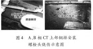 斷路器氣室內部PT阻隔開關A相動觸頭變形,未搭在觸摸銅排上,端頭有明顯炙烤痕跡;B相動觸頭端頭有燒傷痕跡;A相CT旁氣室壁有明顯燒傷痕跡;A相和B相CT上部銅排設備螺栓頭燒傷,斷路器室頂部方位有電弧燒傷痕跡,如圖4所示。