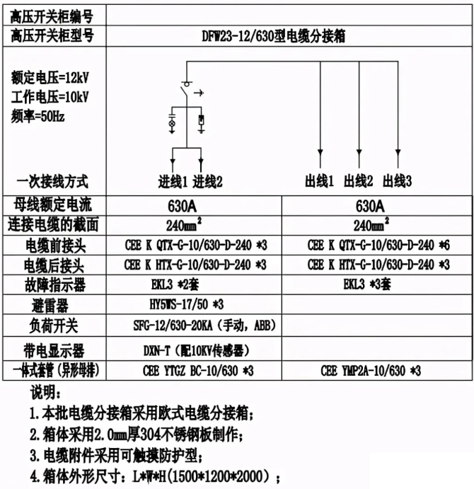 2)歐式電纜分支箱,它的主要特點(diǎn)是雙向開門、利用穿墻套管作為連接母排,具有長度小、電纜排列清楚、三芯電纜不需大跨度交叉等顯著優(yōu)點(diǎn)。一般采用額定電流630A螺栓固定連接式電纜接頭。