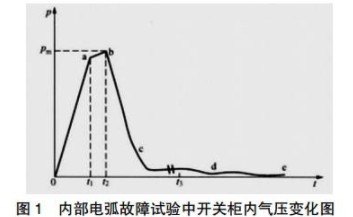 內部故障產生的損壞力與電弧產生的間隔容積,電弧電壓,持續的時間,短路電流大小有關。在電弧產生后,柜體內的壓力進程如圖1所示,壓力進程可以分為四個物理階段如圖1。
